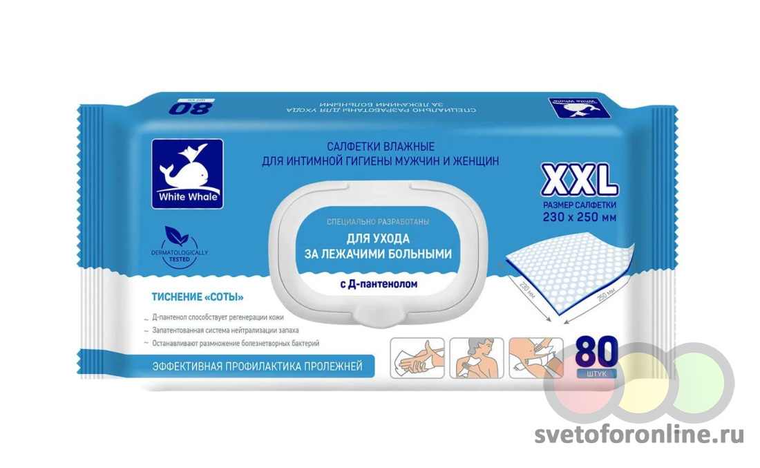 Влажные салфетки "White Whale" для ухода за лежачими больными и интимной гигиены 80шт 230*250мм - Купить в магазине "Светофор" город Москва, Юрловский проезд, д 13